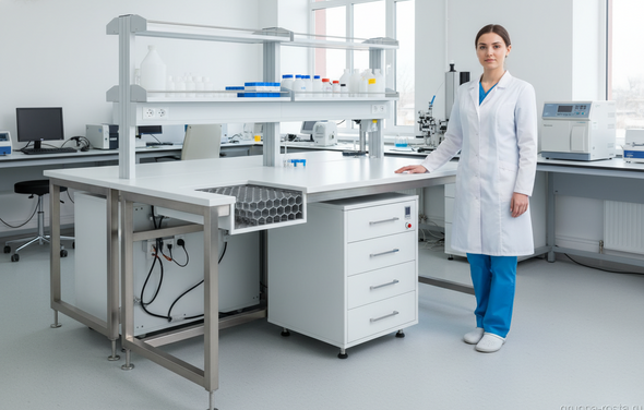 - Подберите материалы поверхности. Для агрессивных сред — эпоксидная столешница и плита из габбро-диабаза или гранита; для чистых помещений — нержавеющая сталь и ESD-покрытия. Уточните химстойкость: кислоты, щелочи, УФ.
