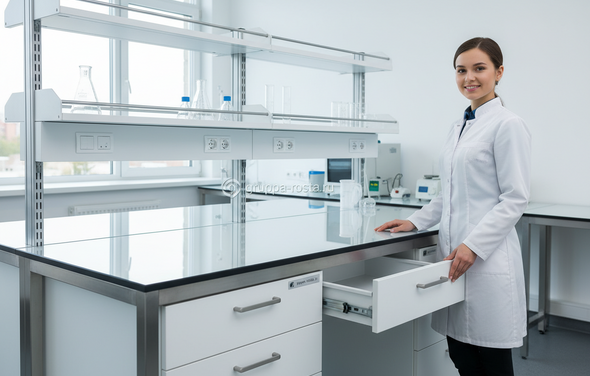- Что сильнее всего влияет на цену: тип столешницы (HPL/фенольная/нерж.), число выдвижных модулей и направляющих, химстойкая фурнитура, локальные вытяжки и сервисные модули, доставка/монтаж в регионы.