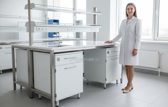 Опции и модули. Подвесные или напольные тумбы, выкатные лотки под приборы, рейлинги с полками и держателями, перфорированные панели, встроенные розеточные модули (обычно IP44), краны воды/газа, мойки со сливом в химстойкий сифон. Для весов — стол с демпфирующей вставкой (камень/гранит, 30–50 мм, резиновые опоры). Для вытяжной системы — столы с перфорированной задней зоной и отводом в воздуховод.