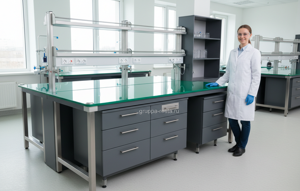 Эргономика. Высота рабочей поверхности 750–900 мм (под сидя/стоя или с надставками), глубина 600–700 мм, свободный коленный проём не менее 600×450 мм. Розетки — на рейлинге над столешницей, не в зоне проливов; крючки для халатов — сбоку. Оснащение: лоток для проводов, держатель для штативов, защитный экран из стекла/поликарбоната у «горячих» зон. Срок службы задаёт не только материал, но и сервис: наличие сменных кромок, съёмных столешниц, типовых узлов фурнитуры.