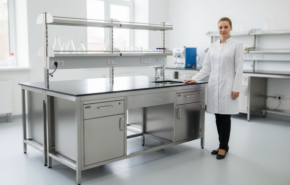 - Смеситель: локтевой/сенсорный, аэратор, подводка в металлической оплётке; горячая вода — если процесс требует; опционально — лабораторные краны для газа/вакуума.