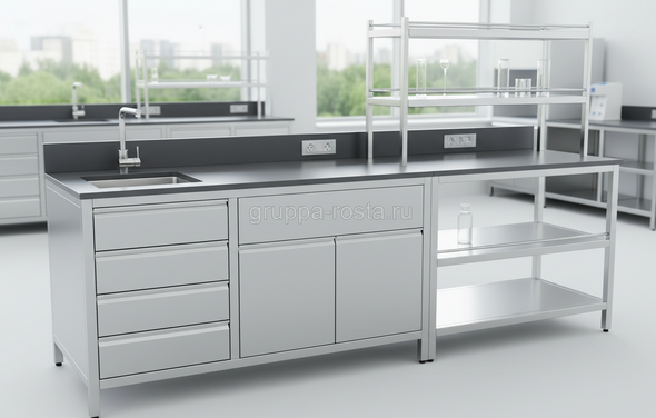Ситуация знакомая: на участке появилась новая методика, нужно мыть посуду и сливать реактивы, а мойка в общем помещении постоянно занята. Решение — отдельный стол с мойкой рядом с рабочей зоной, чтобы не бегать по лаборатории с колбами.