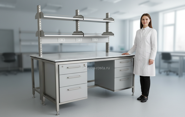 - Что влияет на цену лабораторного стола: материал столешницы (до 40% бюджета), толщина металла и тип рамы, количество и глубина полок, электрические блоки и свет, тумбы и выкатные полки, нестандартные размеры, окраска по RAL, сертификаты и испытания под ТЗ.