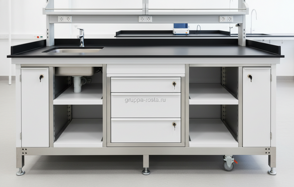 Материалы. Каркас: сталь с порошковым покрытием (60–100 мкм, коррозионная категория C3–C4) или нержавеющая сталь AISI 304/316L. Для агрессивных сред и частых мойк лучше сразу 316L: стойкость к хлоридам и кислотам выше. Столешницы: компакт-ламинат HPL 12–16 мм (химически стойкий, матовый), нержавеющая сталь 1,2–2,0 мм со стальными рёбрами, реже — керамика/фенол (узкие задачи). Кромки — герметичные, без стыков в «мокрой» зоне.