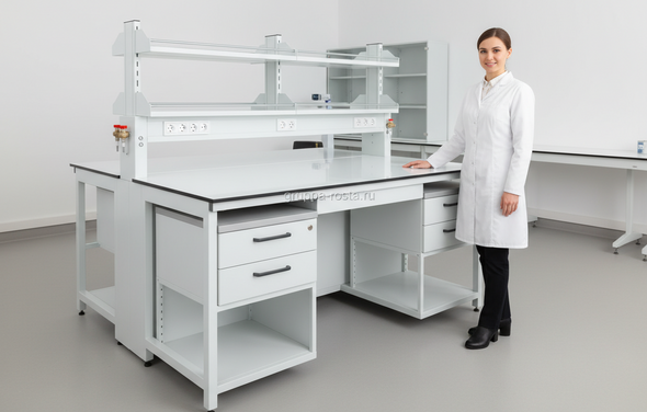 Рабочие модули обычно делают кратными 600/900/1200/1500/1800 мм, глубина 600–750 мм. Каркасы — сварные или сборные из стального профиля 30×30/40×40 мм с порошковым покрытием, тумбы — выкатные/подвесные, надстройки — с полками, рейлингами, светом и коммуникациями. Островные столы берут под групповые работы и расстановку приборов, пристенные — там, где есть вода/канализация/вытяжка. Прокладка коммуникаций по шин-каналам (электрика, слабка, иногда — газ) обеспечивает быструю перестановку без вызова монтажной бригады.