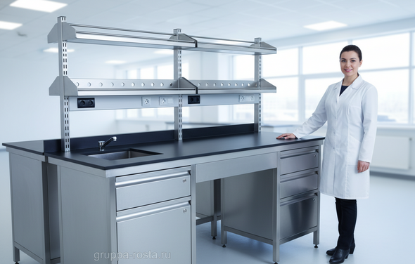 Каркас — сталь с порошковым покрытием или нержавейка; нагрузка на стол не менее 200–300 кг равномерно, выдвижные направляющие — от 30–45 кг на ящик. Мобильные тумбы на химстойких колесах, подиумы под оборудование с виброопорами, сервисные стойки с газом/вакуумом/электрикой — мелочи, которые экономят часы работы и километры «лишних» шагов.