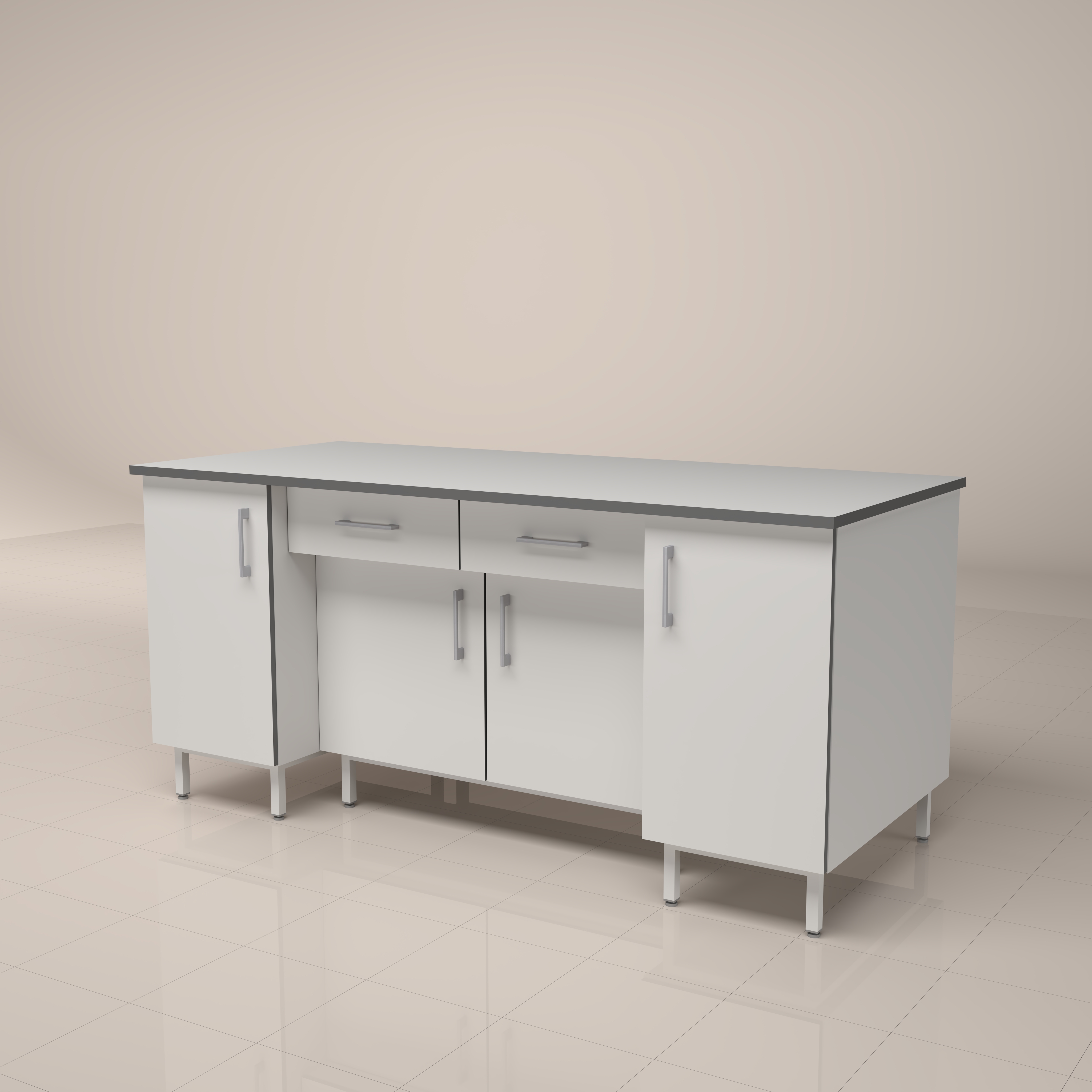 Центральная тумба состоит из 2х выдвижных ящиков, 2 дверки, 1 съемная полка